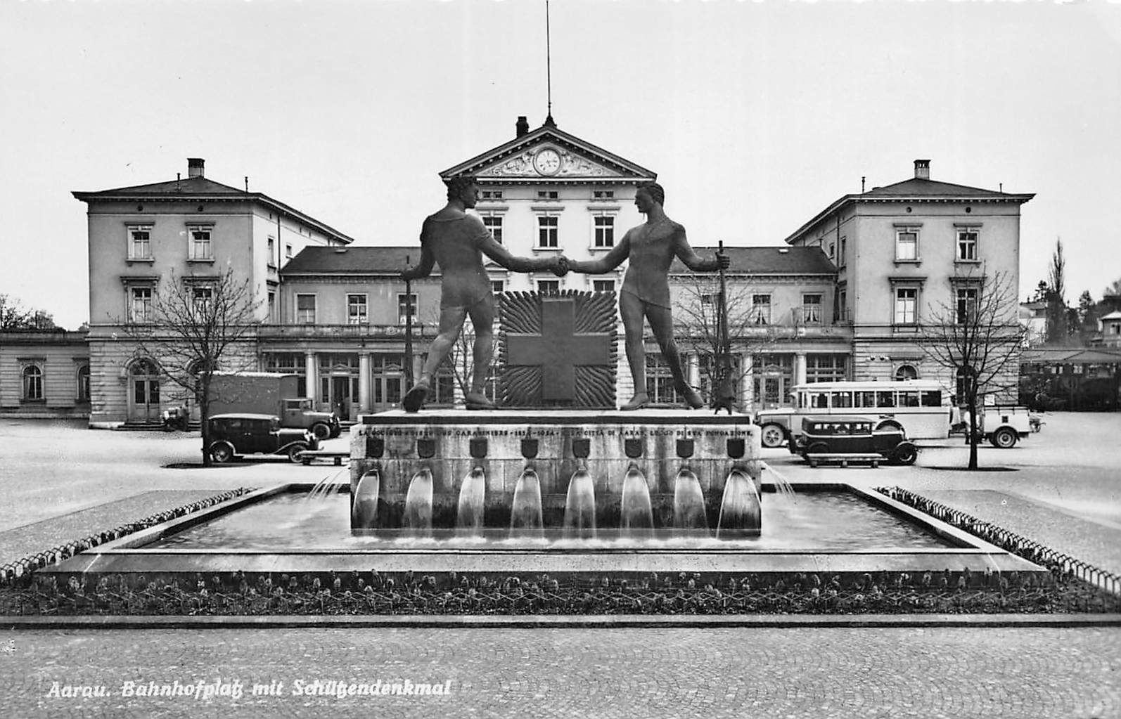 Aarau, Bahnhofplatz mit Schützendenkmal, Autos