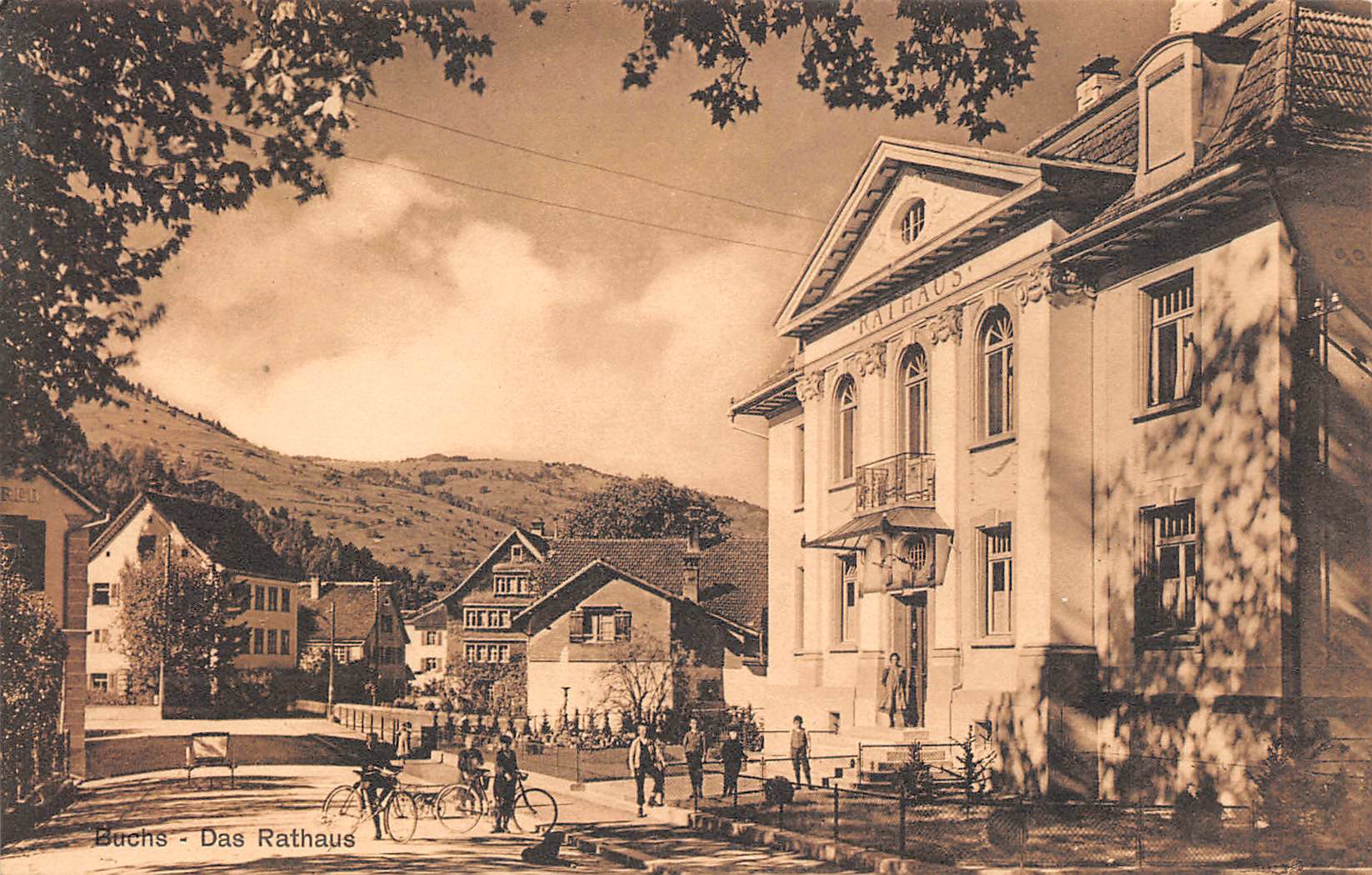Buchs SG, Rathaus mit Velofahrer Menge