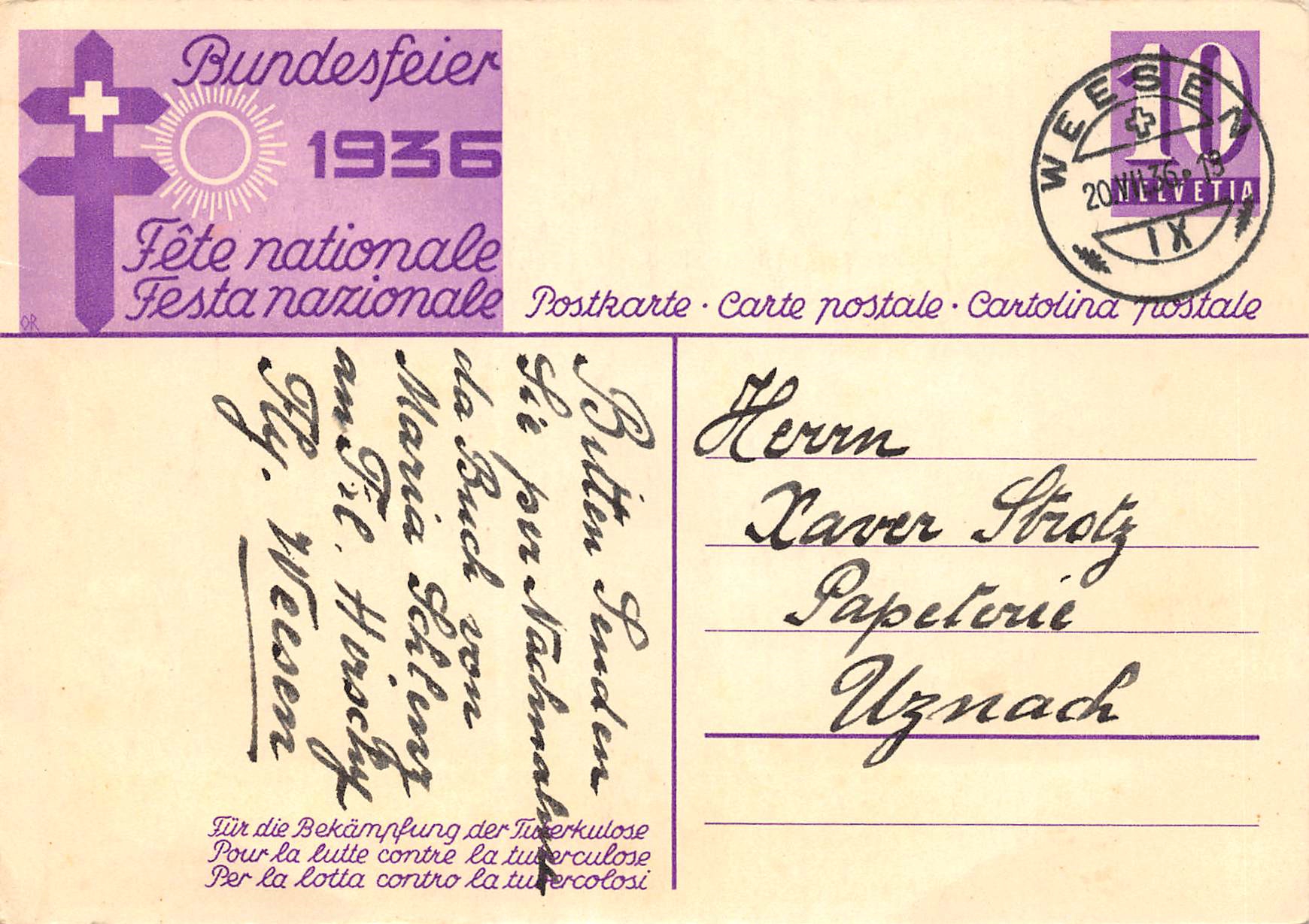 Bundesfeierkarte Nr.63, gelaufen, Kat. 12.- Menge