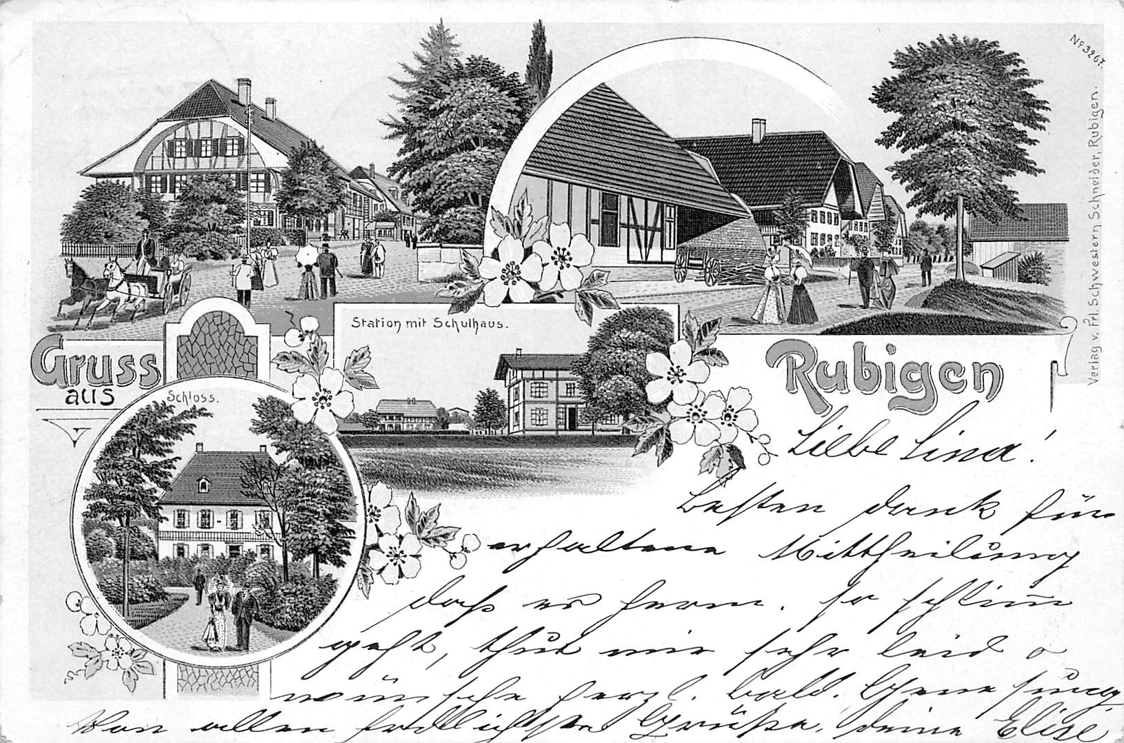 Rubigen, Gruss aus Rubigen, Station mit Schulhaus, Schloss Menge