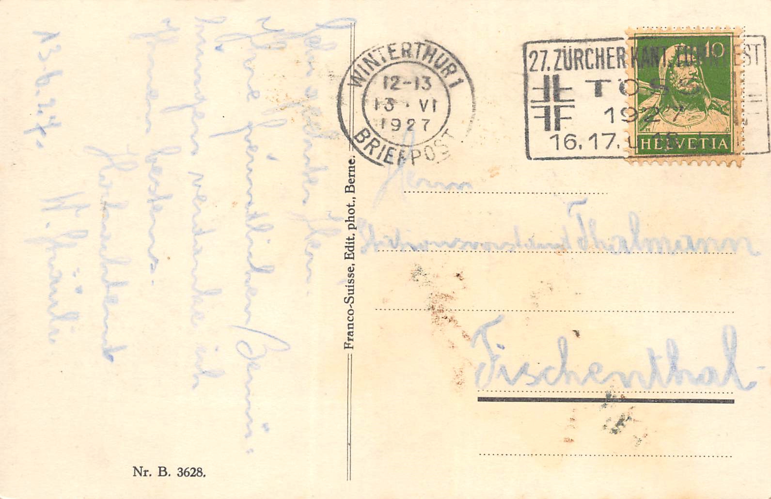 gelaufen 1927, Stempel Zürcher Kantonalturnfest Töss 1927